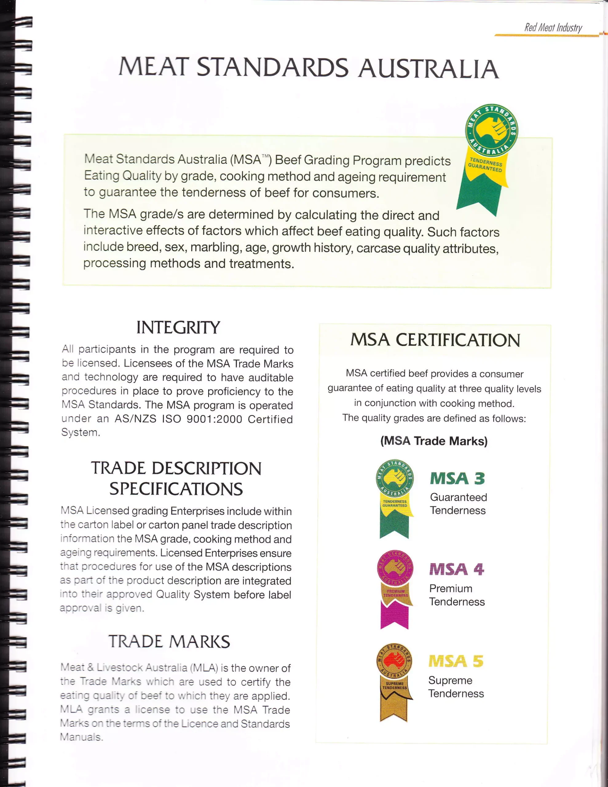MSA là hệ thống đánh giá chất lượng ăn uống (eating quality) khắt khe nhất thế giới, được phát triển dựa trên nghiên cứu khoa học và dữ liệu thực nghiệm từ hàng ngàn thử nghiệm nếm thử thịt bò. MSA không chỉ đánh giá chất lượng thịt mà còn gợi ý phương pháp nấu phù hợp để tối ưu trải nghiệm ẩm thực.