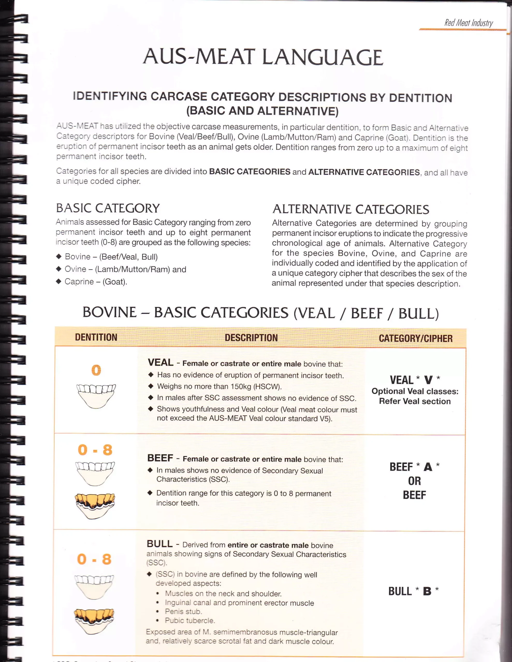 Hệ thống phân loại bò Úc dựa chủ yếu vào hai yếu tố: số răng vĩnh viễn (dentition) và dấu hiệu giới tính thứ cấp (Secondary Sexual Characteristics – SSC). Đây là chuẩn mực quốc gia giúp xác định độ tuổi sinh lý, giới tính và chất lượng thịt của con bò.