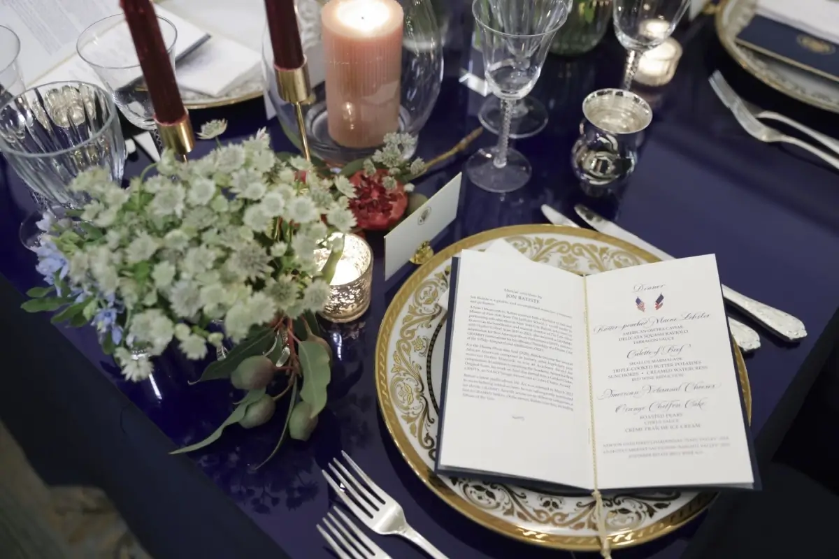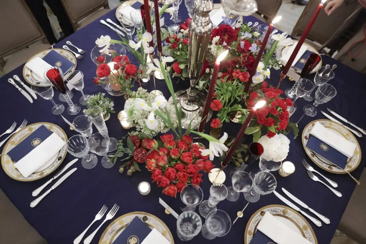 Một điểm nhấn không thể bỏ qua trong các bữa quốc yến chính là cách trang trí bàn ăn và lựa chọn đồ uống. Mỗi bàn tiệc tại Nhà Trắng đều được trang trí công phu với bộ đồ sứ, dao nĩa bạc, ly pha lê và khăn vải được gấp tỉ mỉ theo kiểu truyền thống.