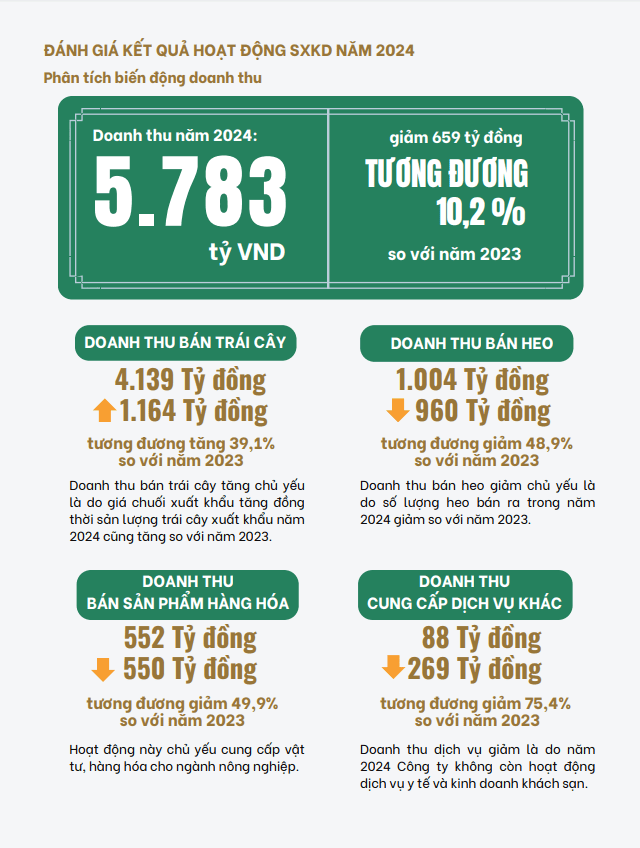 - Năm 2024, doanh thu bán heo giảm phân nửa so với 2023 (còn 103 tỷ đồng), lãi gộp chỉ 85 tỷ đồng, biên lãi gộp 8%.