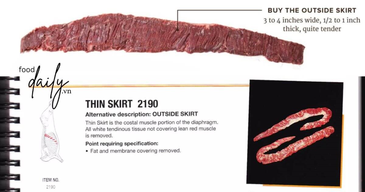 • Phân biệt: Outside skirt khác inside skirt ở vị trí cắt và độ mềm. Outside skirt mềm, thơm, ngọt hơn và được đánh giá cao hơn trong các nhà hàng nướng, xào cao cấp.