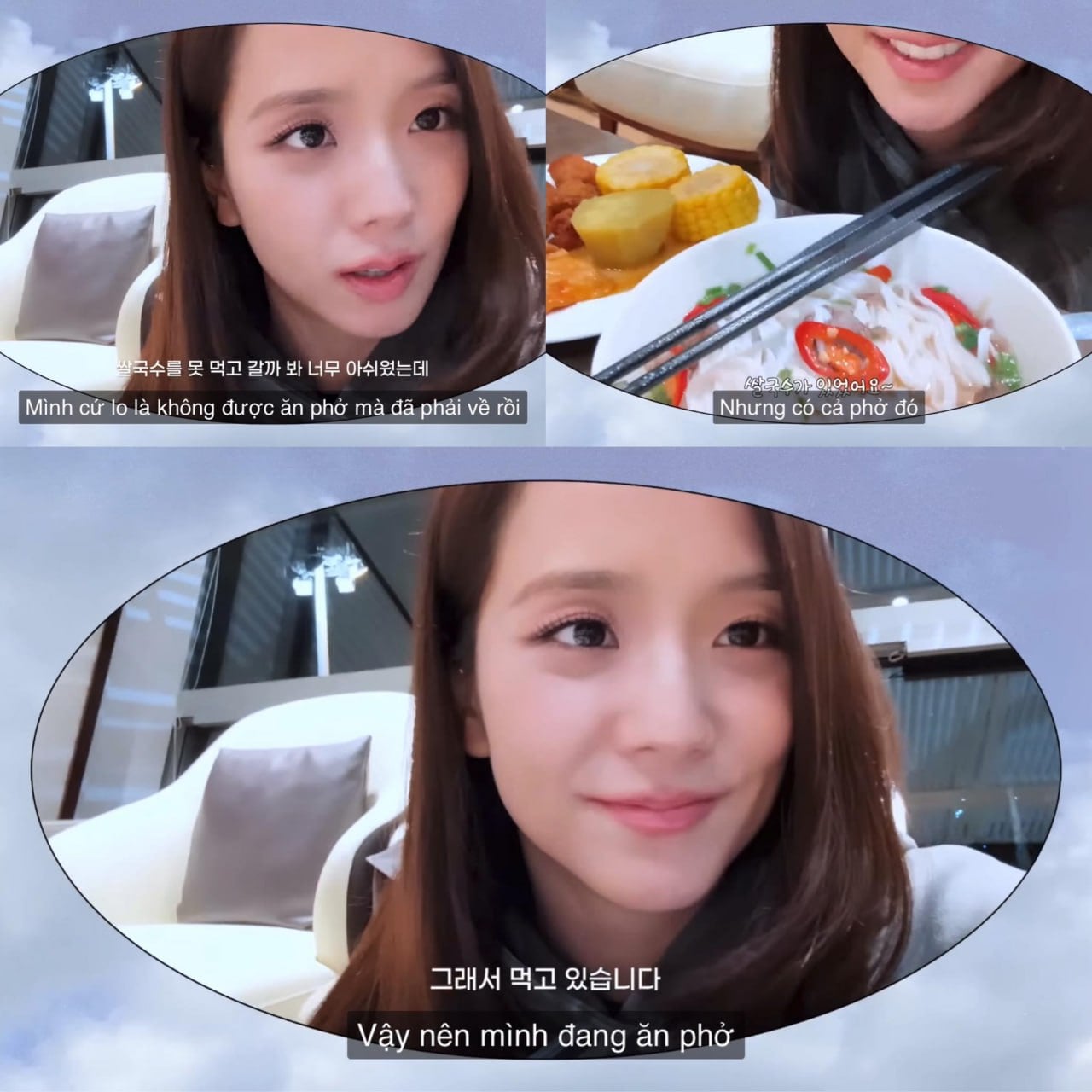Trong vlog hậu trường buổi fan meeting tại Hà Nội, Jisoo chia sẻ rằng cô đã rất buồn khi nghĩ rằng sẽ không kịp thưởng thức món phở do lịch trình bận rộn. Tuy nhiên, điều bất ngờ đã xảy ra khi ê-kíp đã chuẩn bị cho cô một bữa ăn đậm chất Việt ngay tại phòng chờ sân bay, khiến cô vô cùng hạnh phúc và xúc động.