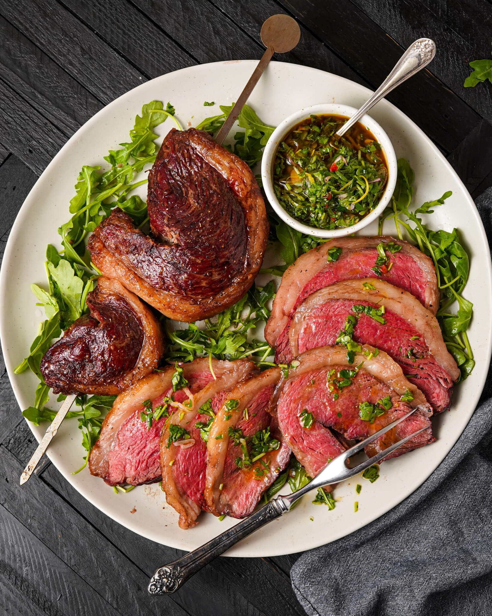 - Cắt lát mỏng ngang thớ, ăn kèm sốt chimichurri, farofa, salad vinaigrette.
