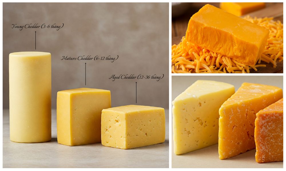- Young Cheddar (3–6 tháng): Mềm, nhẹ, vị kem và hơi mặn.