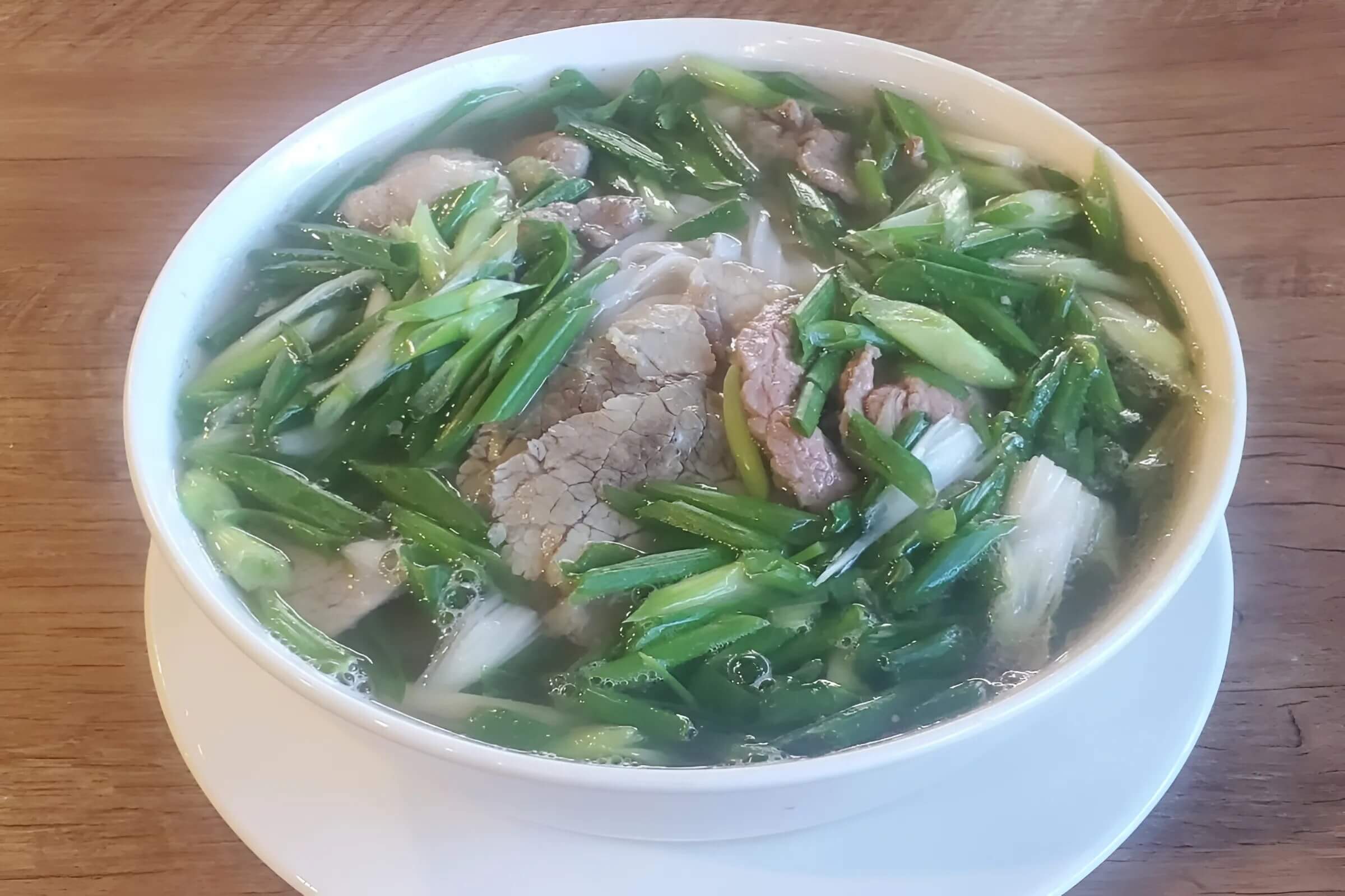 Tô phở khi mở ra, vẫn giữ được nhiệt và mùi thơm đặc trưng. Sợi bánh phở bản lớn, thịt bò mềm và đậm vị, nước dùng nghiêng về vị béo, hậu ngọt và rất “Hà Nội”. Không có rau sống kiểu miền Nam, thay vào đó là hành lá ngập tràn.