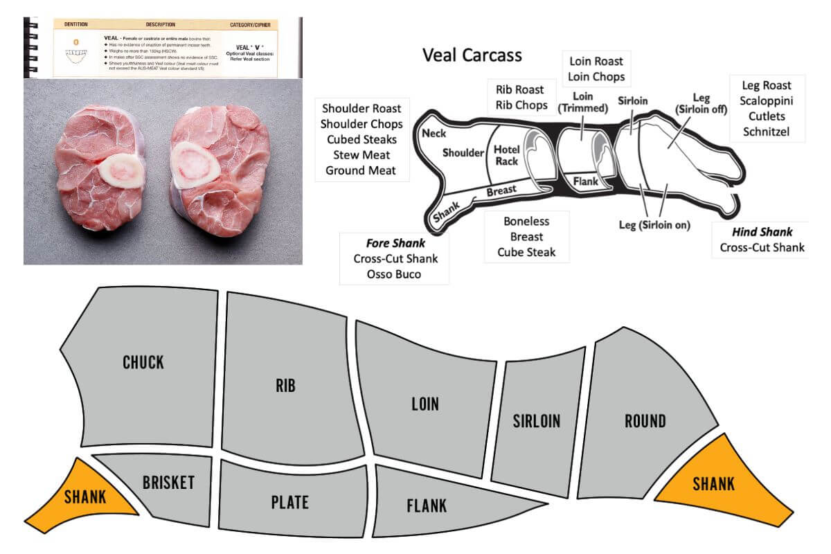 Shank cross cut là phần thịt lấy từ xương ống chân của bê hoặc bò, được cắt ngang thành từng khoanh dày, mỗi khoanh đều có một đoạn xương tròn ở giữa chứa đầy tủy xương béo ngậy. Đây là phần thịt vận động nhiều nên giàu mô liên kết, khá dai khi nấu nhanh nhưng lại trở nên mềm tan, thơm ngọt khi hầm lâu với nhiệt độ thấp.