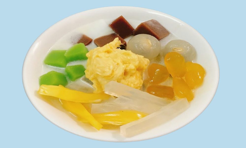 Không thể thiếu trong danh sách tráng miệng mùa hè chính là chè khúc bạch – một món ngọt từng gây “sốt xình xịch” trên mạng xã hội. Những miếng khúc bạch mềm dẻo, dai nhẹ, hòa quyện cùng nhãn lồng, hạnh nhân lát và nước đường thanh mát tạo nên món ăn vừa thanh lịch vừa sang trọng. Bí quyết nằm ở nguyên liệu gelatin và kem tươi chuẩn Ý giúp món ăn có độ mịn mượt đặc trưng.