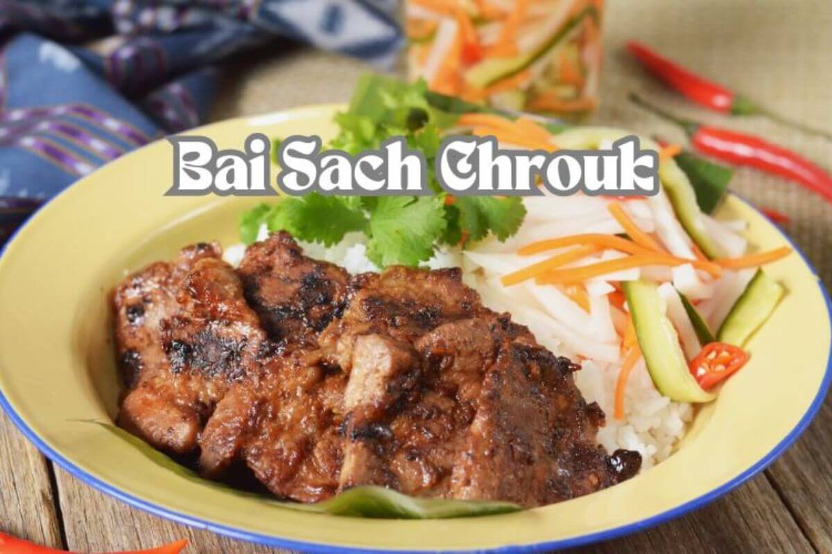 Bai Sach Chrouk là món ăn sáng phổ biến, được mệnh danh là “linh hồn của ẩm thực đường phố Campuchia”. Thịt heo thái lát mỏng, ướp nước cốt dừa, tỏi, đôi khi thêm nước mắm hoặc đường thốt nốt, sau đó nướng từ từ trên than hồng để giữ được độ mềm và vị ngọt tự nhiên. Món ăn thường ăn kèm cơm trắng, dưa chuột, củ cải muối, gừng và bát nước dùng gà với hành tươi.