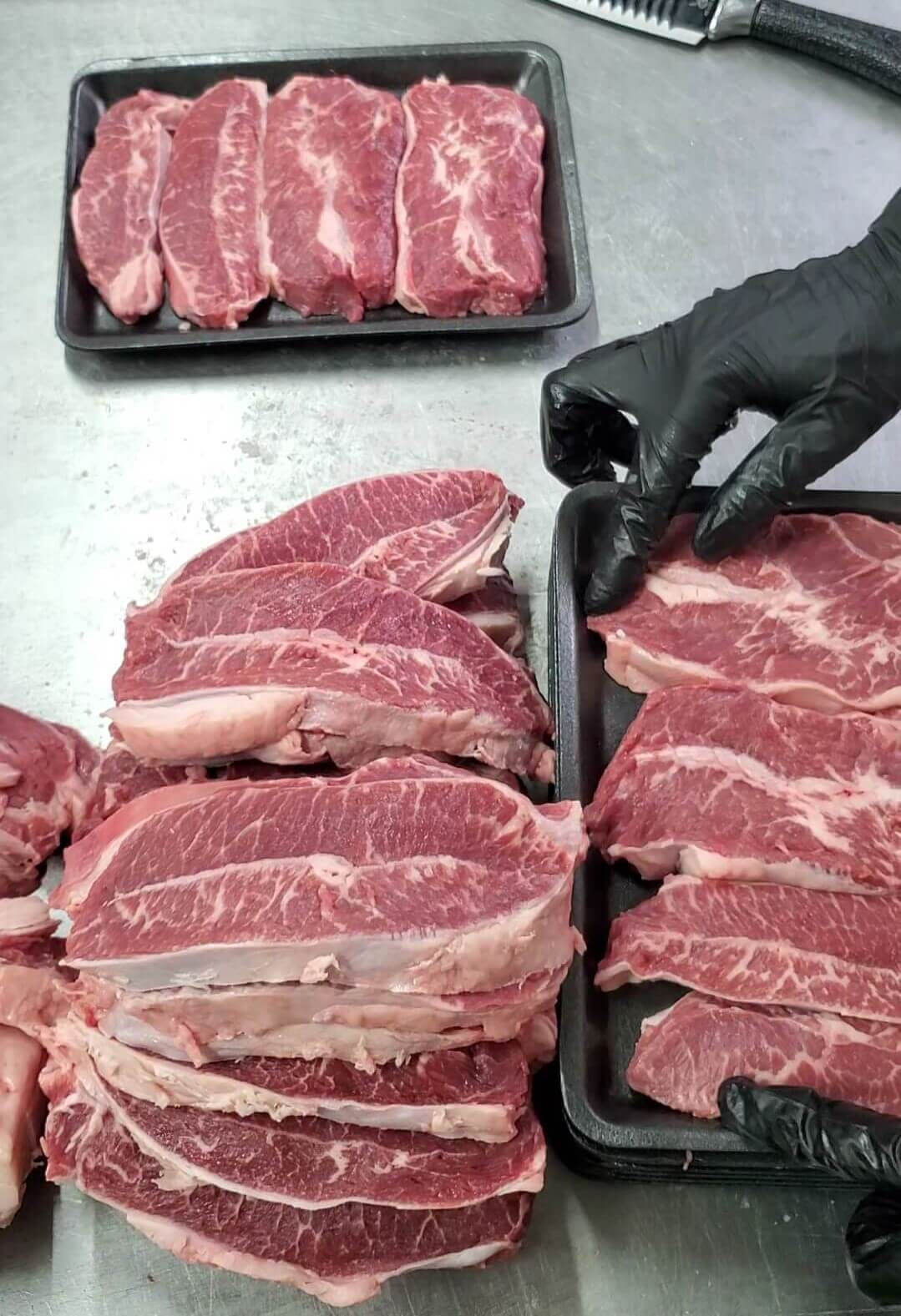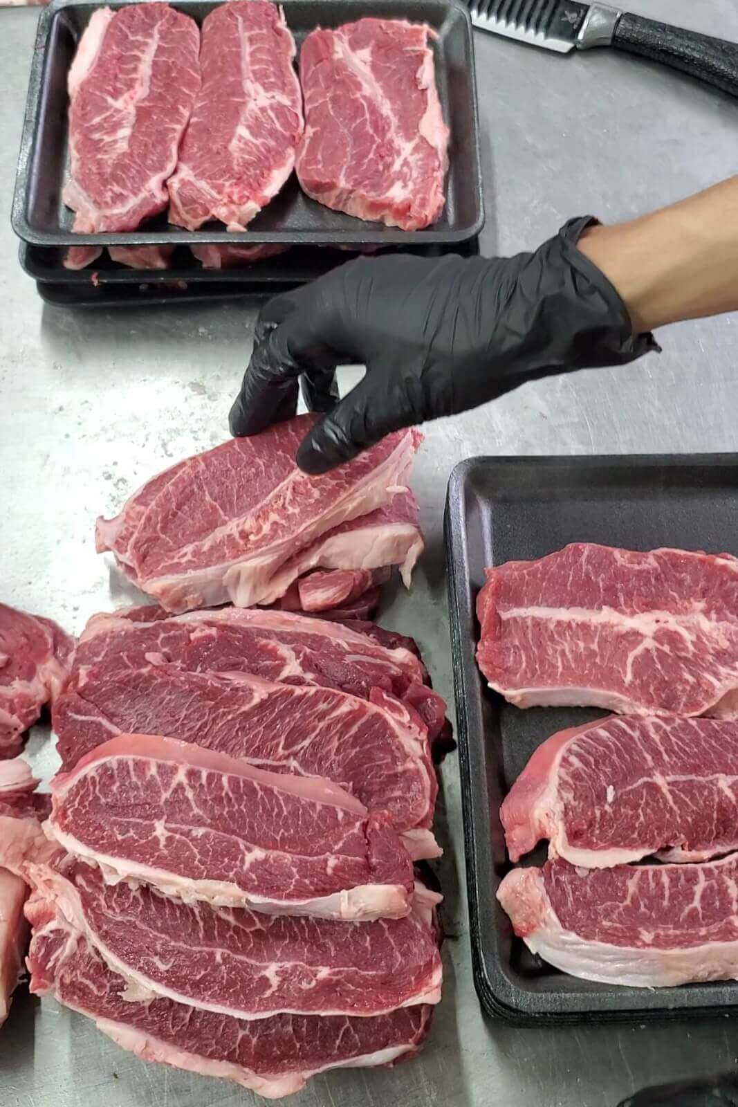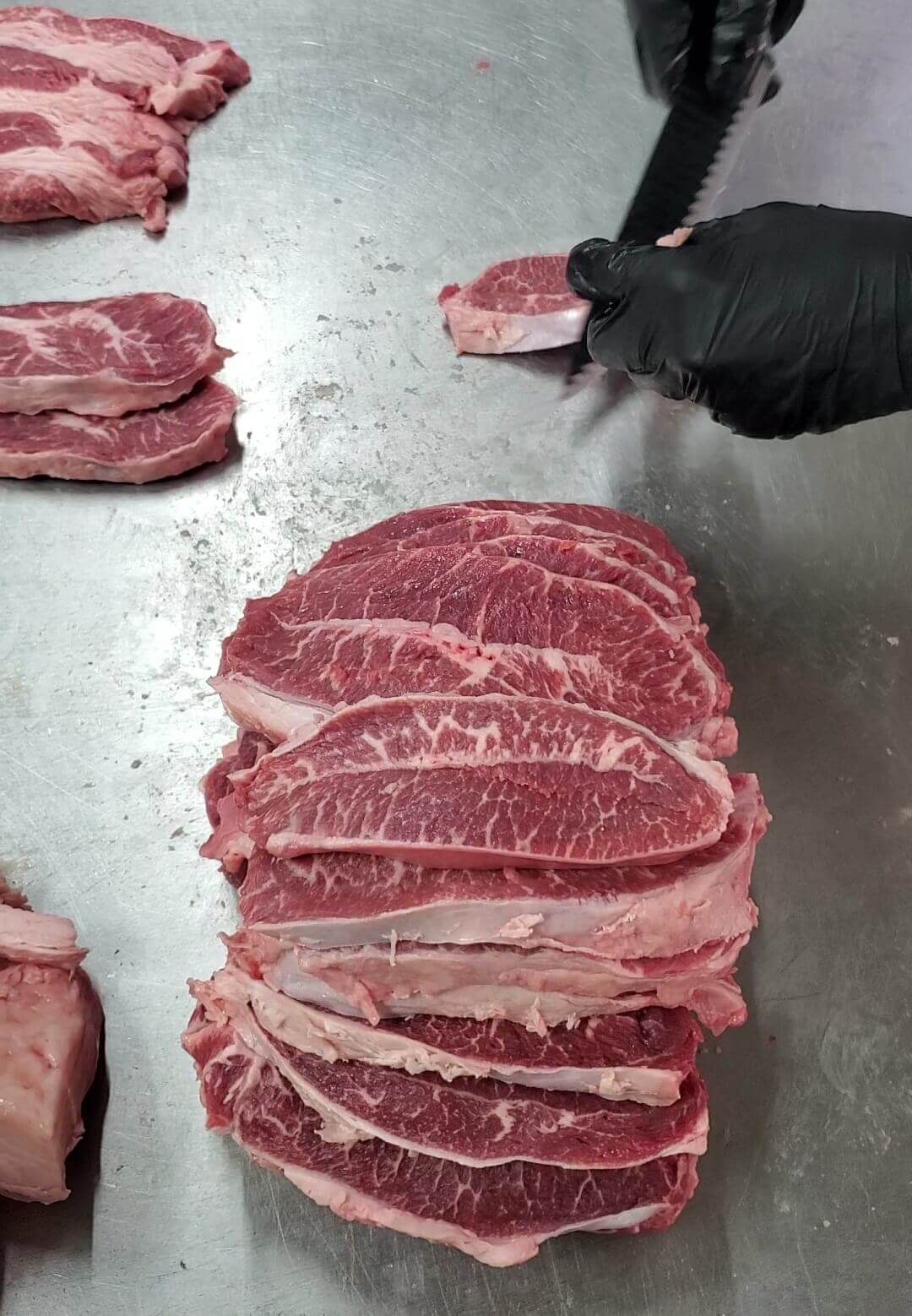 Cách tôi cắt: chia cây thịt theo chiều dài, canh thớ thịt nằm ngang (ngang với đường dao), rồi cứ thế cắt dứt khoát mỗi lát đúng bằng nhau. Tổng cộng một cây oyster blade 2.5kg, tôi cắt được hoảng 10 lát, mỗi lát nặng tầm 150gram đúng chuẩn phần ăn nhà hàng.